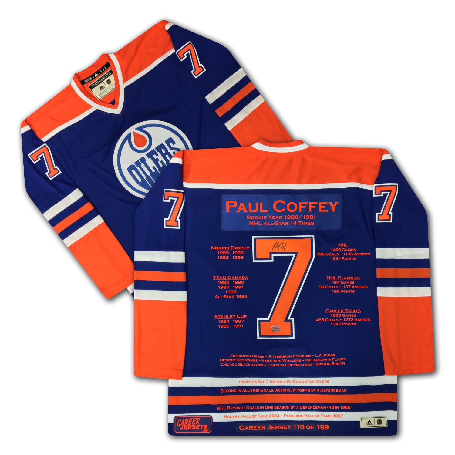 PAUL COFFEY CAREER JERSEY AUTOGRAPHED - LTD ED 199 - EDMONTON OILERS