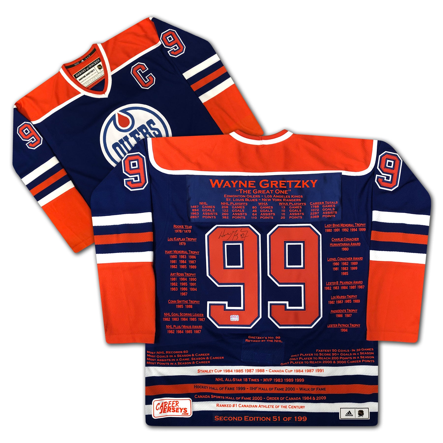 The Wayne Gretzky "Heroes Of Hockey" Second Edition Career Jersey is an autographed limited edition jersey, very rare and a great investment. The jersey is custom made with the accomplishments that highlighted his unbelievable career and numbered out of the 199 that exist. It comes with a Certificate of Authenticity matching the edition number and guaranteeing the autograph. Includes a Upper Deck Authenticated certificate, validating the signature. Do not miss this opportunity to own a true piece of Hockey History.