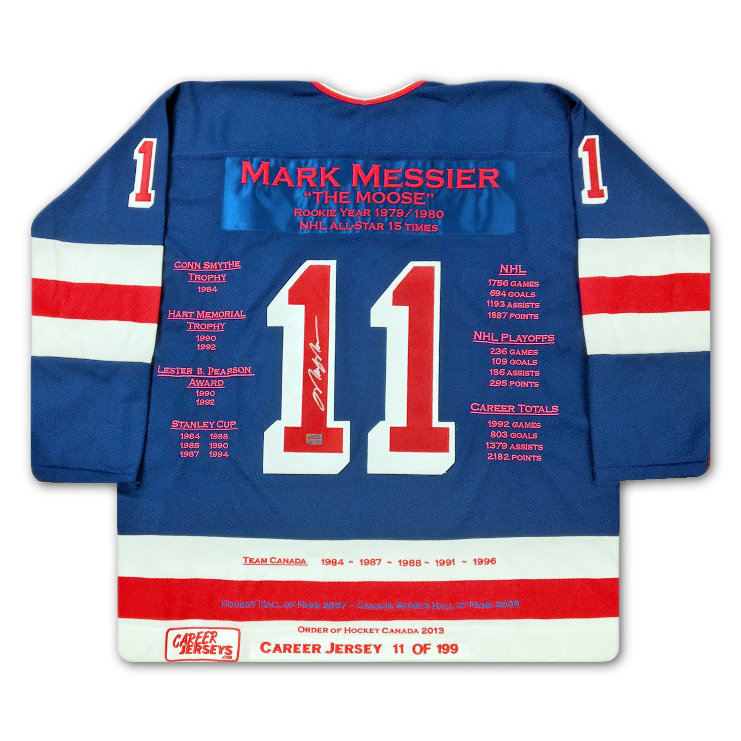 The Mark Messier NYR Career Jersey is an autographed limited edition jersey, very rare and a great investment. The jersey is custom made with the accomplishments that highlighted his legendary career and numbered out of the 199 that exist.