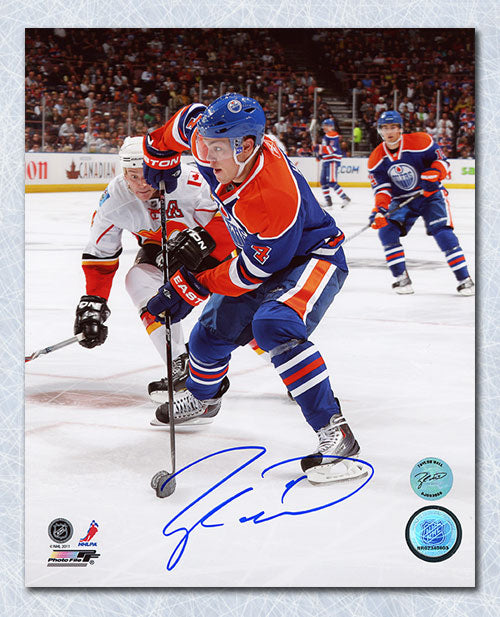 TAYLOR HALL EDMONTON OILERS AUTOGRAPHED FIRST NHL GAME 8X10 PHOTO