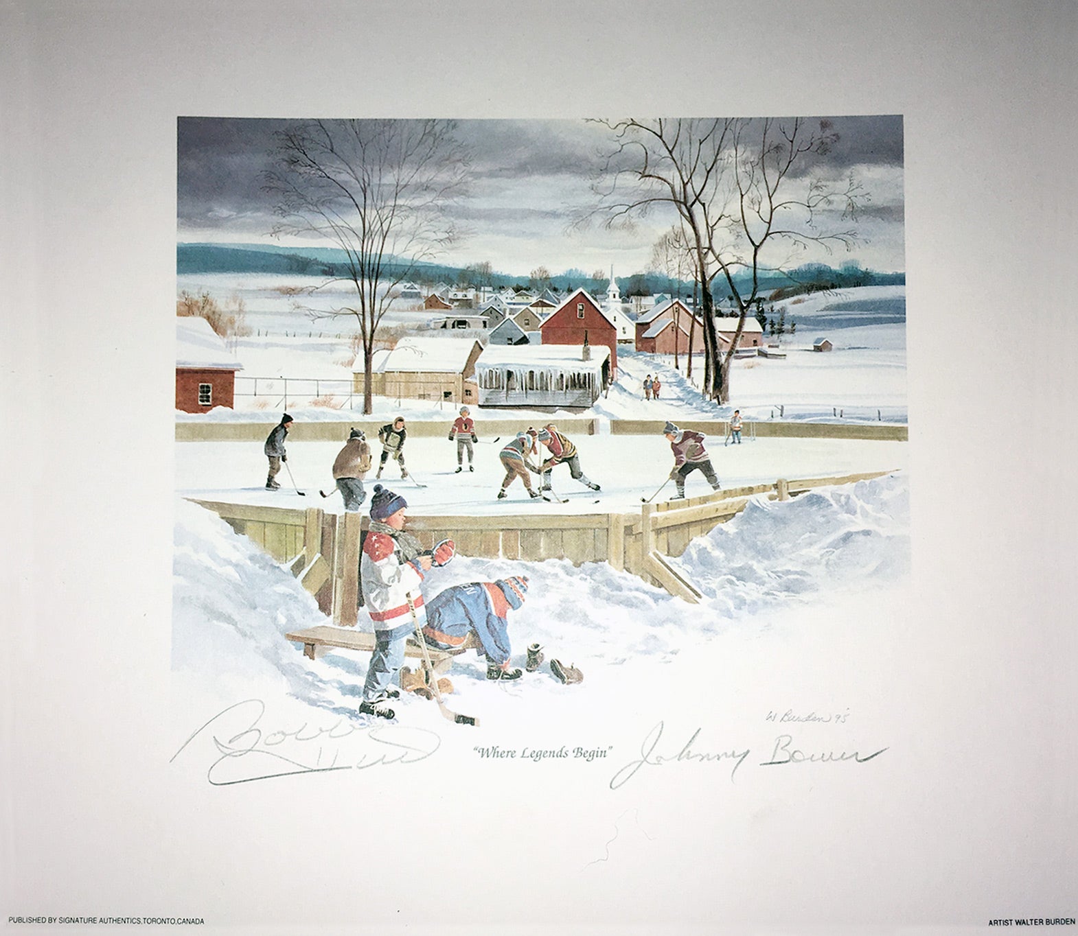 Autographed Lithograph signed by: Johnny Bower and Bobby Hull from Toronto Maple Leafs and Chicago Blackhawks. This piece of memorabilia measures 10 x 10 inches. Comes with Certificate of Authenticity and Hologram. Own this Piece of Hockey History!