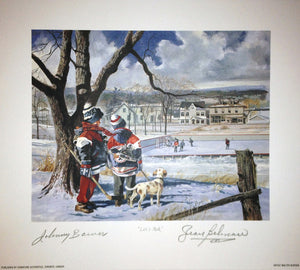 Lithographie autographiée signée par: Johnny Bower et Jean Beliveau des Maple Leafs de Toronto et des Canadiens de Montréal. Ce morceau de souvenirs mesure 9,5 x 8,5 pouces. Livré avec certificat d'authenticité et hologramme. Possédez ce morceau d'histoire du hockey!