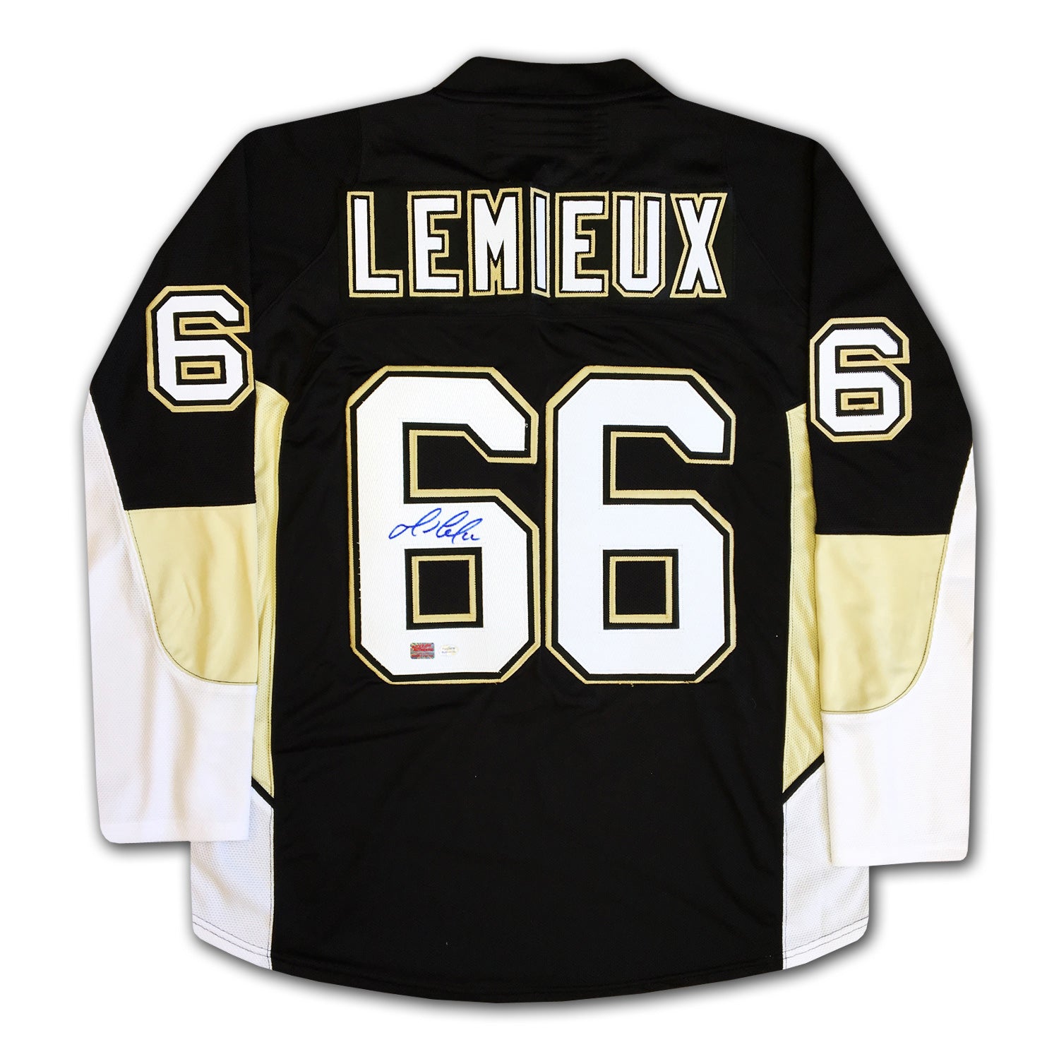 Hockey Legend, Mario Lemieux, maillot noir dédicacé des Penguins de Pittsburgh. Le maillot est cousu professionnellement, avec un numéro de feutre cousu. Livré avec hologramme et certificat d'authenticité. Possédez ce morceau d'histoire du hockey!